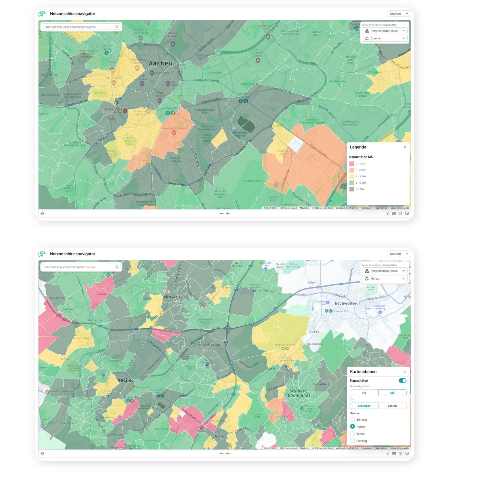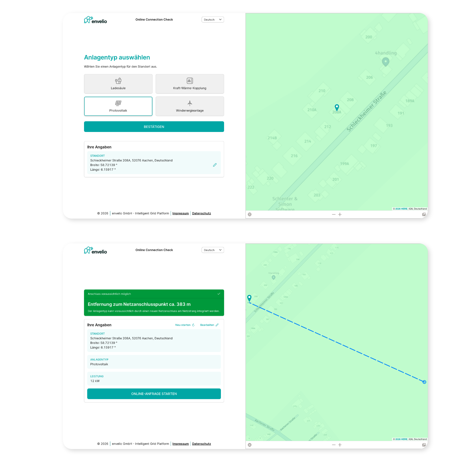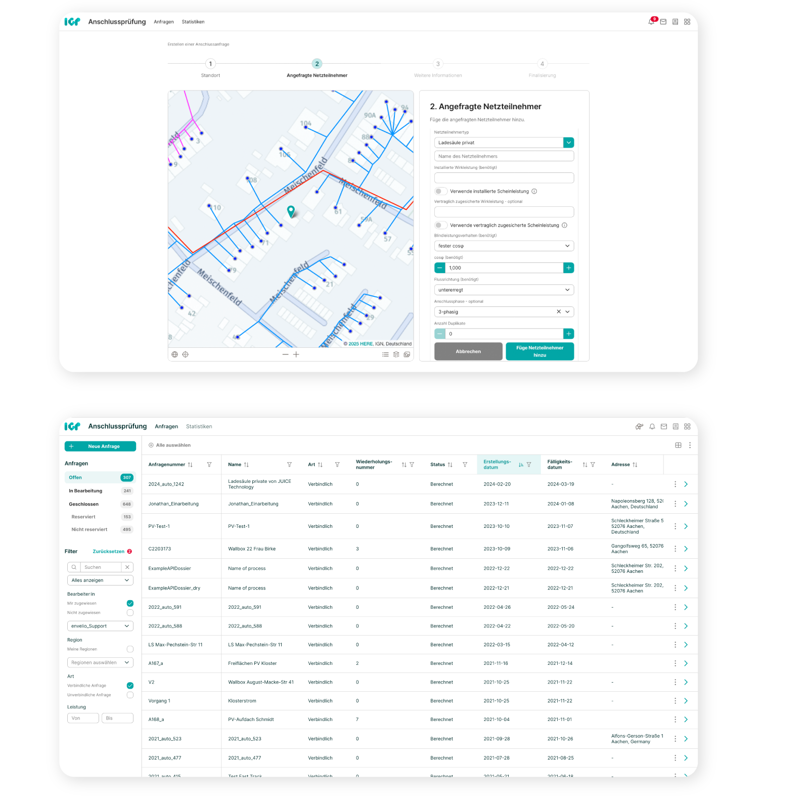 Ja, absolut. Als Basis für die Bearbeitung von Netzanschlussanfragen dient ein rechenfähiges Modell für euer Netz, das die notwendigen Daten u.a. zu jeder bereits angeschlossenen Anlage (ihre Leistung, Flussrichtung usw.) enthält. Bei der nutzerfreundlichen grafischen Oberfläche der Intelligent Grid Platform müssen deine Kolleg:innen nur die Daten wie Adresse und Leistung für eine neue PV-Anlage, Wärmepumpe, Wallbox oder Ladesäule einpflegen. Die technische Prüfung auf potenzielle Kapazitätsengpässe sowie die Ermittlung der möglichen Verknüpfungspunkte erfolgt dann per Knopfdruck, schnell und automatisch.