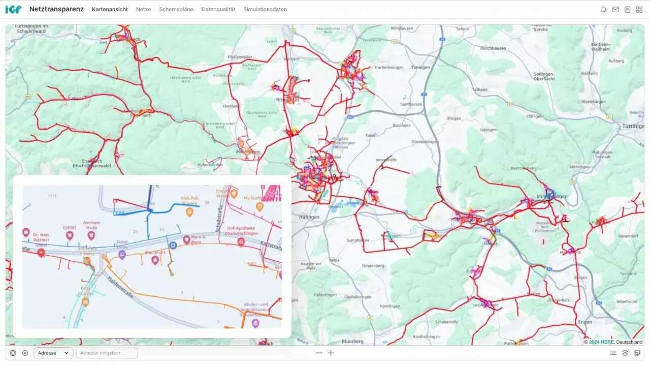 In der App werden alle relevanten Netzdaten zusammengeführt und sind dadurch zentral an einem Ort gebündelt einsehbar. Dies schafft eine umfassende Übersicht des gesamten Netzes, vereinfacht viele Prozessabläufe deutlich, und ermöglicht eine detaillierte Analyse der Netzstruktur und Netzbelastung.
