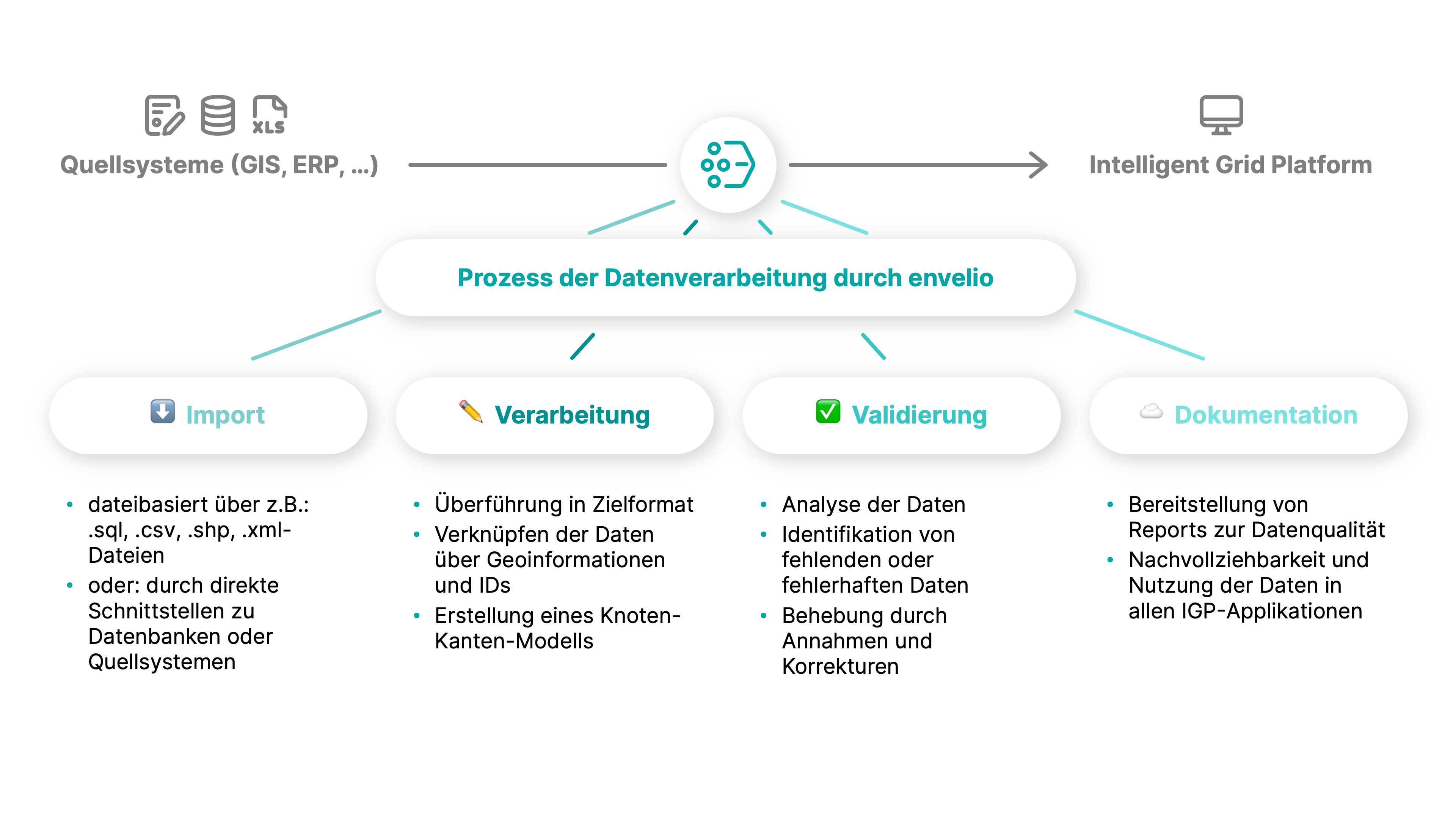 Im Data Onboarding führen wir eure bestehenden Netzdaten aus verschiedenen Systemen (z. B. GIS, ERP, EDM) zusammen, bereinigen sie strukturiert und integrieren sie in die Plattform.