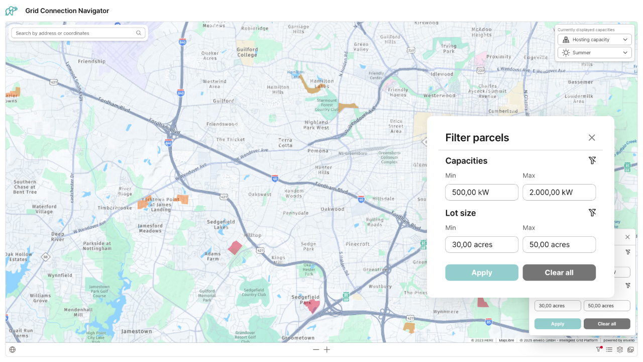El Navegador de Conexiones a la Red ofrece una amplia gama de filtros para encontrar capacidad de red disponible en niveles de tensión específicos y afinar los resultados eligiendo entre demanda (cargas) o generación. Además, múltiples estilos de mapa y capas visualizan claramente los datos relevantes, agilizando significativamente la selección y el análisis de emplazamientos.