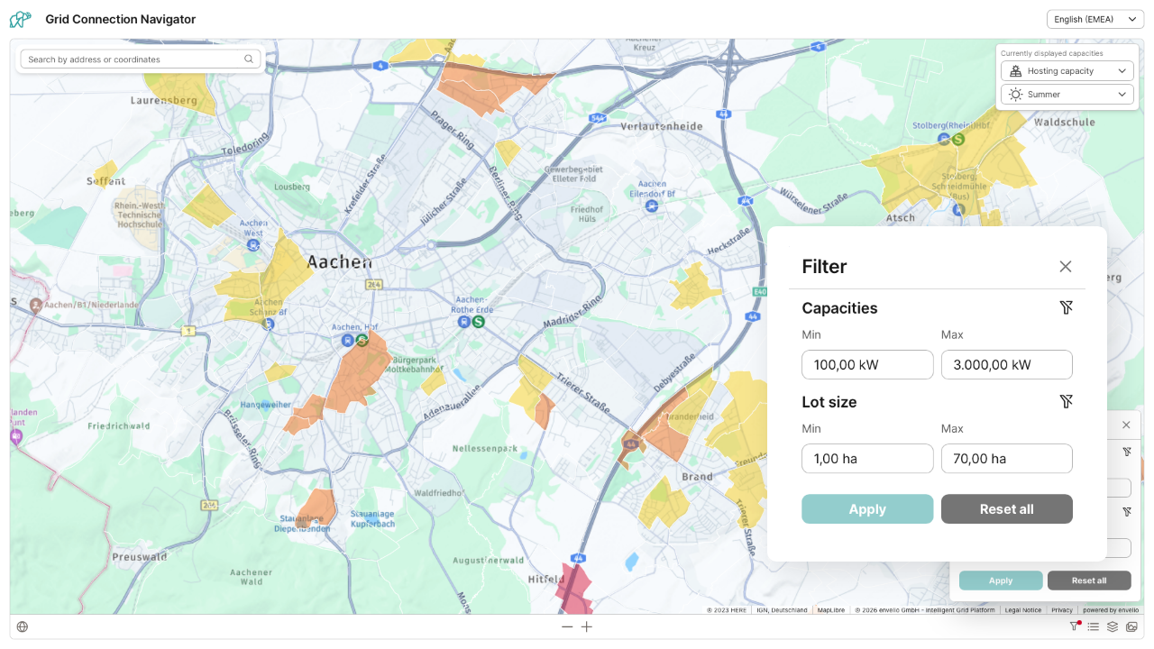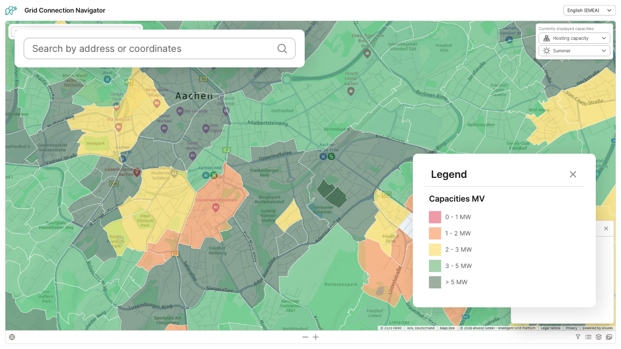 The interactive map enables searches for specific addresses and direct comparisons between different locations. Thanks to the visual representation, grid capacity is displayed at a glance: Areas on the map are color-coded according to availability. This provides maximum clarity and simplifies the selection of a suitable location.